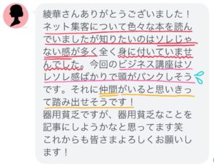 - こんにちは^^ 体感できるスピリチュアルサロンSEFIRA(セフィラ) スピリチュアルカウンセラー綾華です 【起業コンサルご感想 Kさま】 綾華さんありがとうございました! ネット集客について色々な本を読んでいました […]